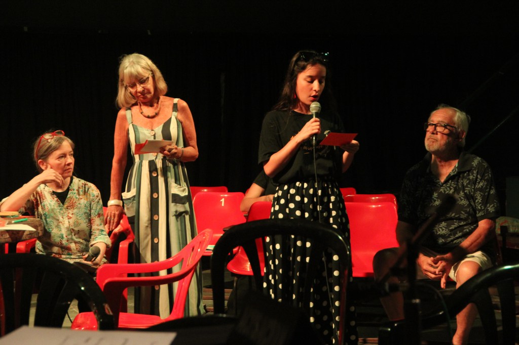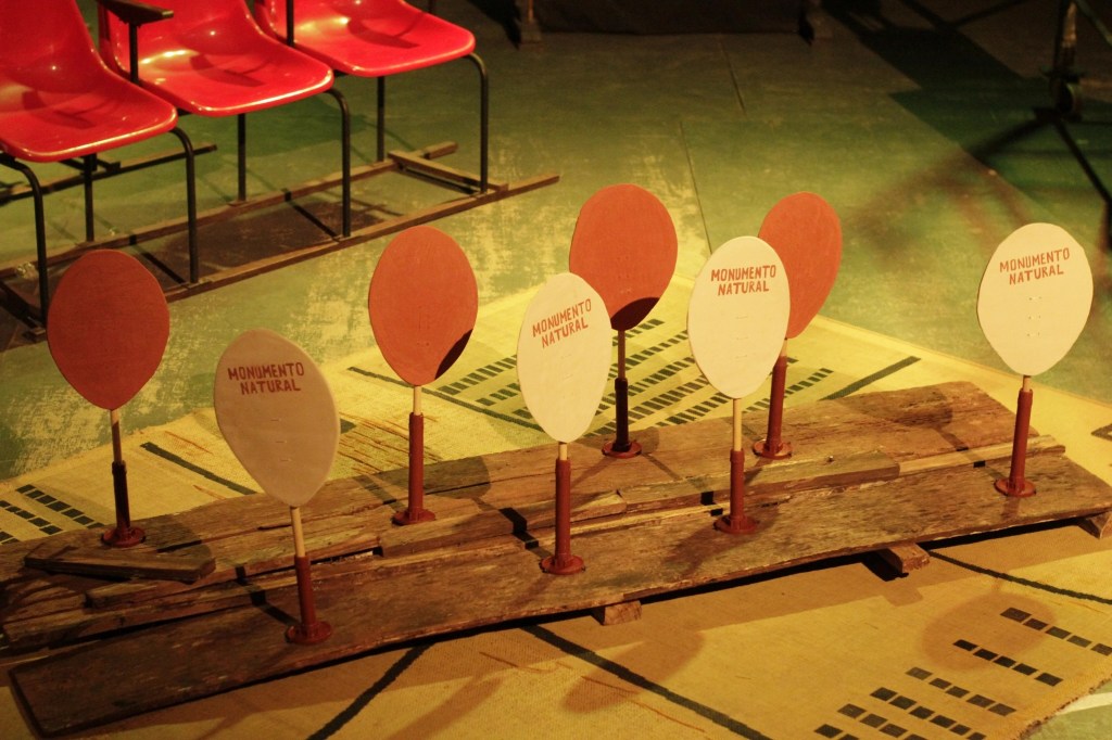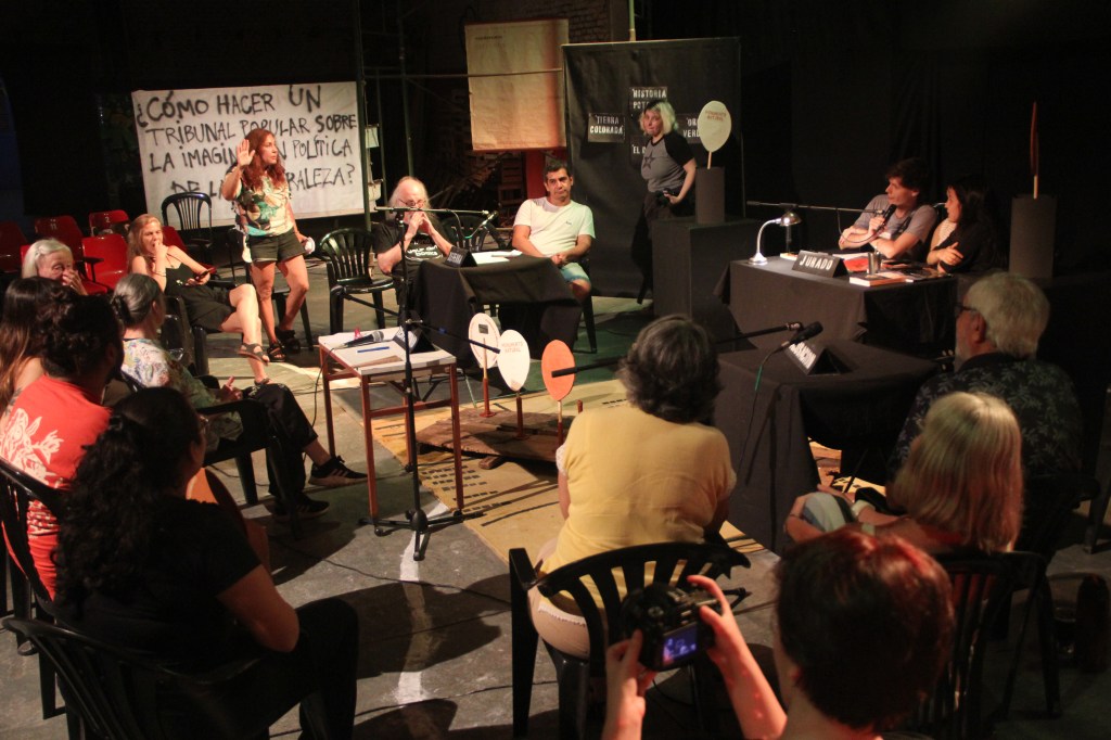 El cuarto “acto” tuvo lugar en el escenario, donde una pequeña escena de juicio, que había permanecido en los márgenes del mismo durante las jornadas anteriores (mesas con micrófonos, sillas vacías y carteles indicando la función de quienes ocupan esos lugares en un juicio) se expandió hasta ocupar todo el espacio. El público aceptó dejar las gradas para implicarse en el ensayo de una respuesta a aquella pregunta de ¿cómo hacer un tribunal popular sobre la imaginación política de la “naturaleza”?, es decir, la propuesta de poner en escena un tribunal popular, a modo de una re-creación colectiva que recogiera las preguntas, “pruebas” documentales, y discursos que circularon en las tres jornadas anteriores.