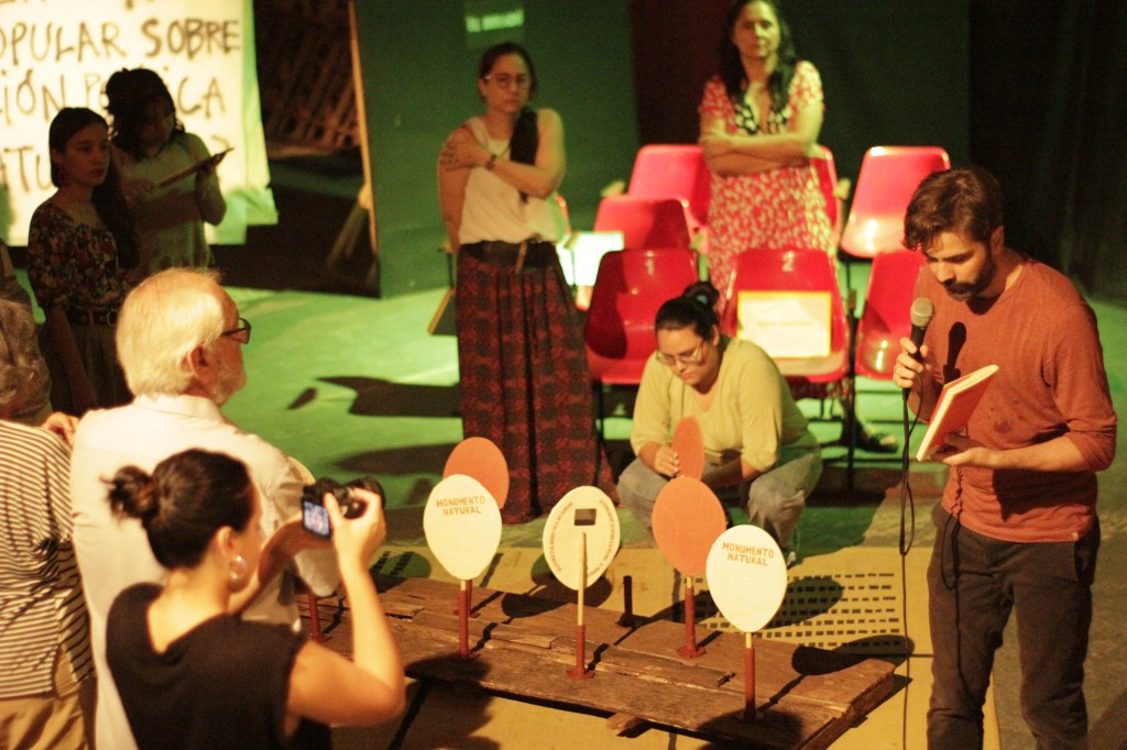 ¿Cómo hacer un tribunal popular sobre la imaginación política de la “naturaleza”? La pregunta escrita sobre una pancarta recibía a las personas que iban llegando, algunas se acomodaron en las gradas; otras, las ponencias invitadas, en el escenario. La pregunta acompañó el Foro durante su celebración en cuatro jornadas y, en el devenir de las diferentes sesiones, la división tradicional de público y ponentes se fue disolviendo.